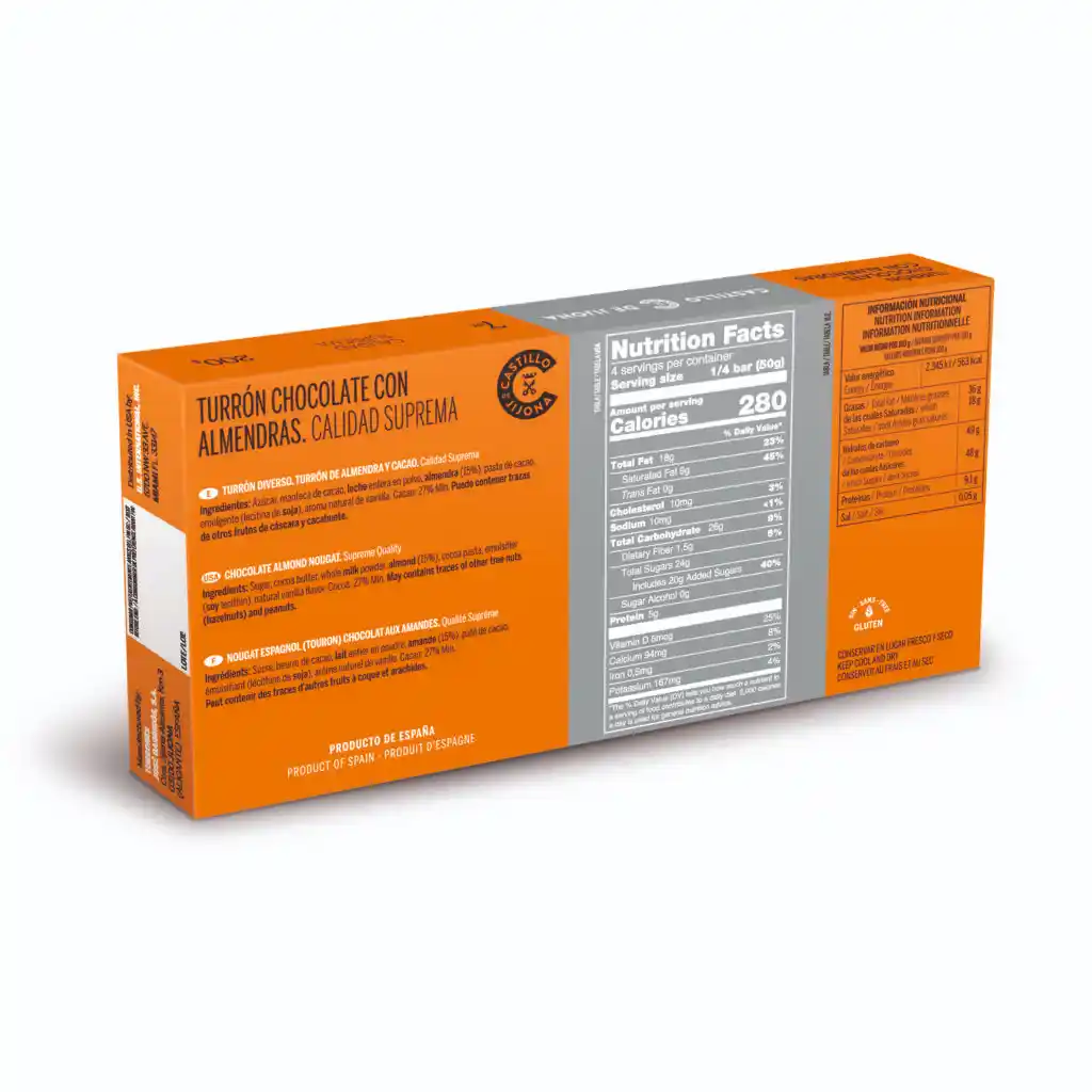 Disfruta de la autenticidad y calidad de Castillo de Jijona con nuestro Turrón Chocolate con Almendras, una delicia que celebra la armonía de los sabores tradicionales.