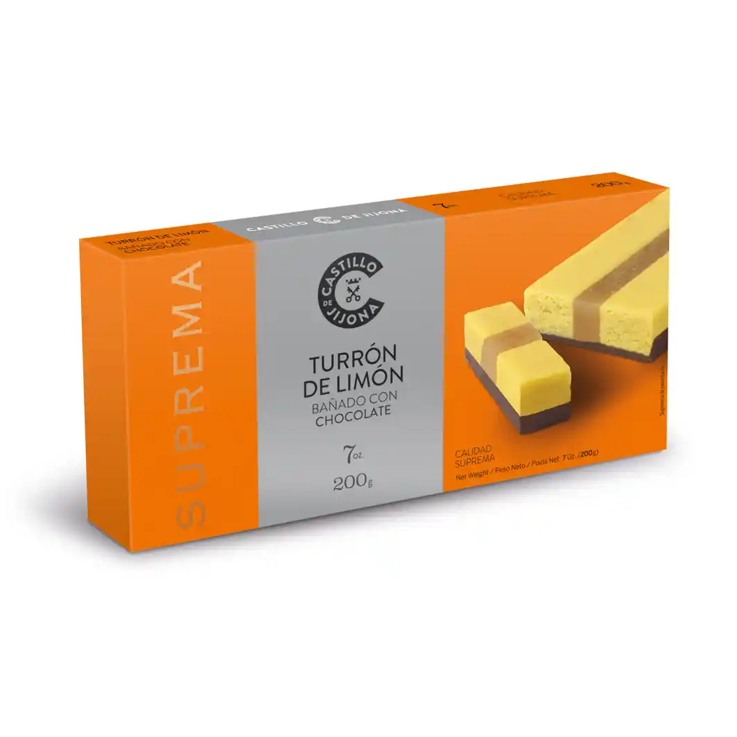 El Turrón de Limón Bañado con Chocolate está pensado para los amantes de los sabores cítricos y refrescantes. En su interior encontrarás una masa suave con notas de limón y fruta confitada, que aporta una sensación ligera y perfumada en boca.