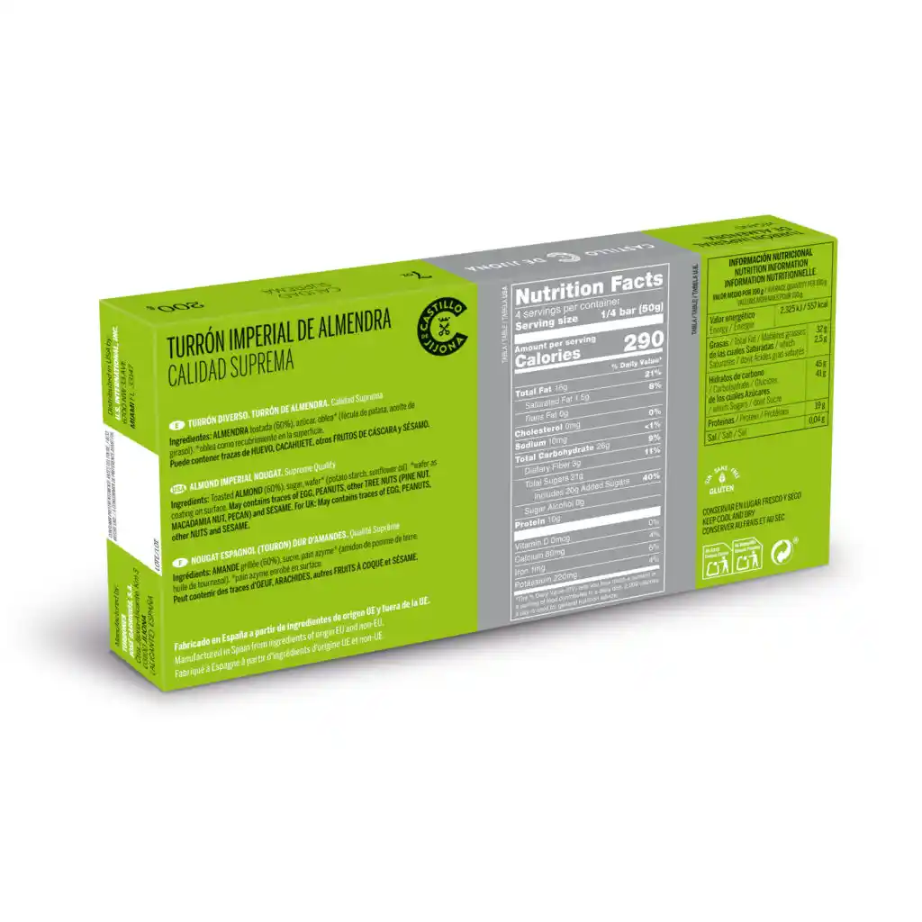 La empresa Castillo de Jijona, conocida por su compromiso con la calidad y la diversidad alimentaria, elabora este turrón vegano con pasión y experiencia, garantizando que cada porción sea una experiencia de sabor inigualable y ética. Descubre el placer de disfrutar de lo tradicional con un toque moderno y respetuoso en cada mordisco con el Turrón Imperial de Almendra Vegano de Castillo de Jijona.